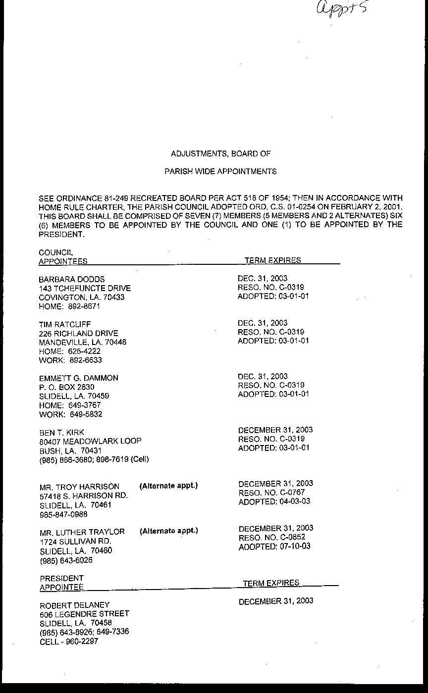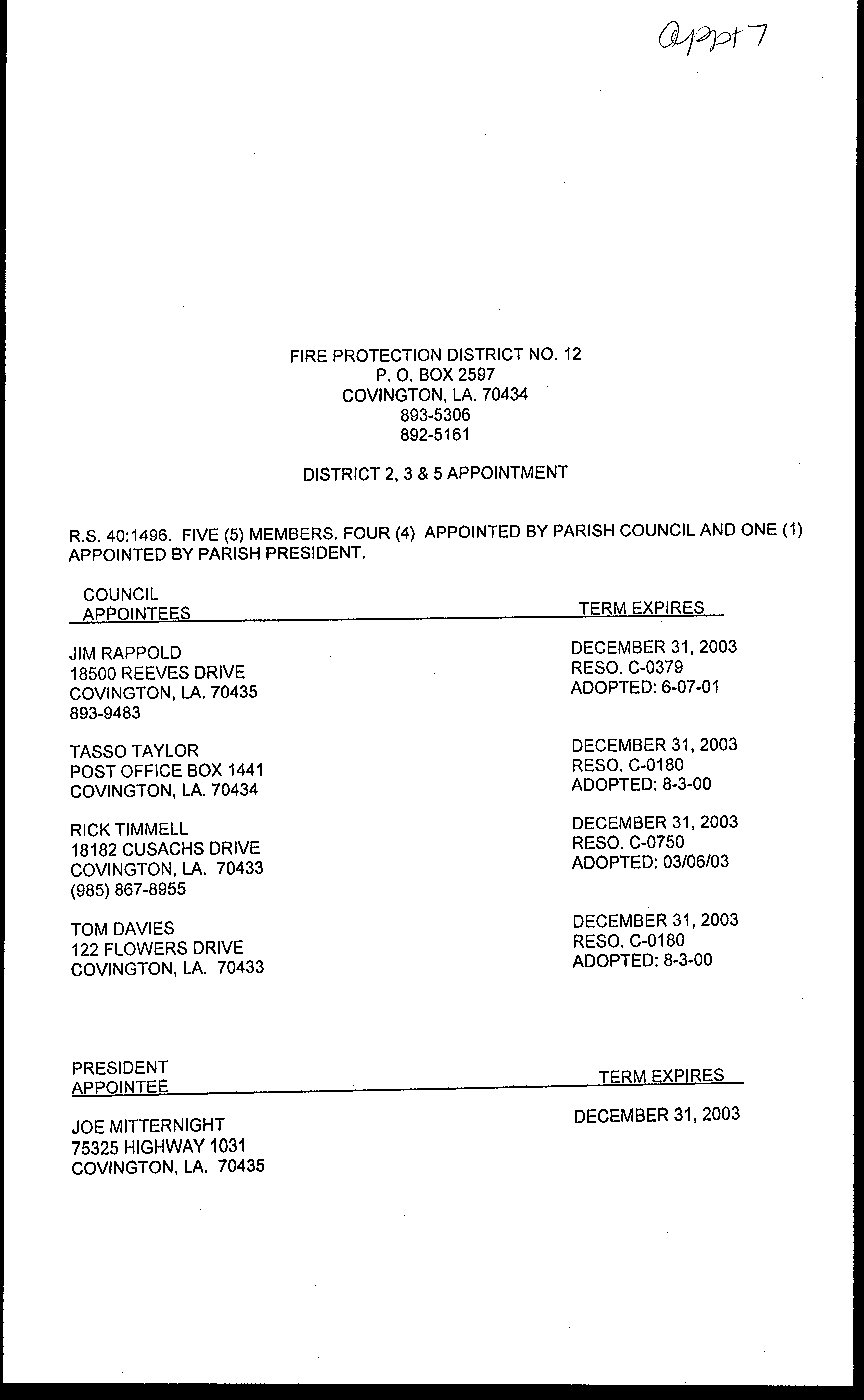 1) Resolution to appoint members to Board of Sewerage District No. 14. (Tammany Hills)