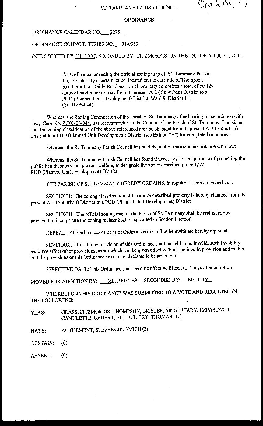 with law, Case No. ZC 01-06-044, has recommended to the Council of the Parish of St. Tammany,