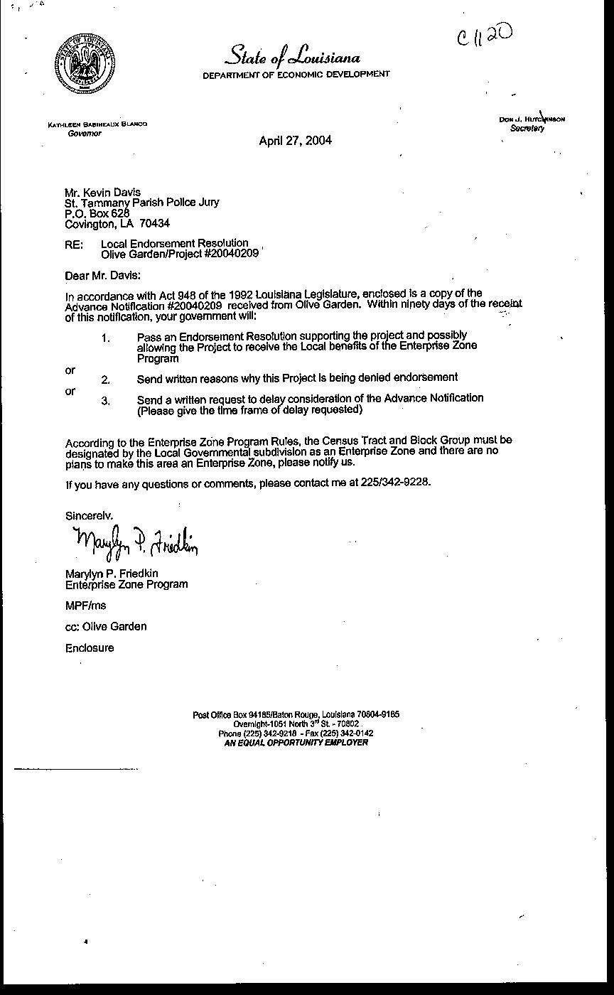ENDORSEMENT OF OLIVE GARDEN, FOR PARTICIPATION IN THE BENEFITS
