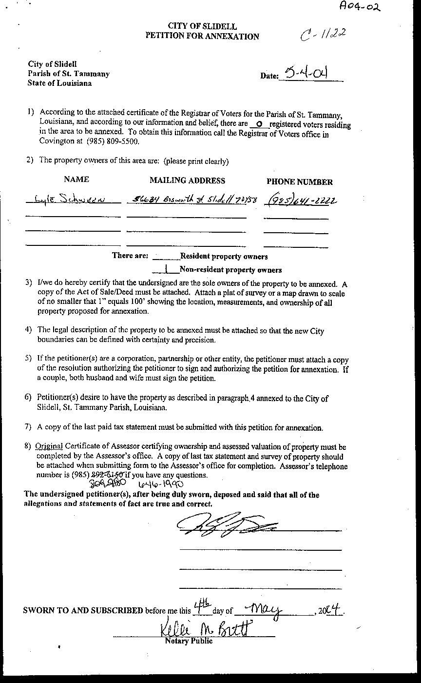 WHEREAS, the City of Slidell is contemplating Annexation of 2.5 acres of land more or less owned