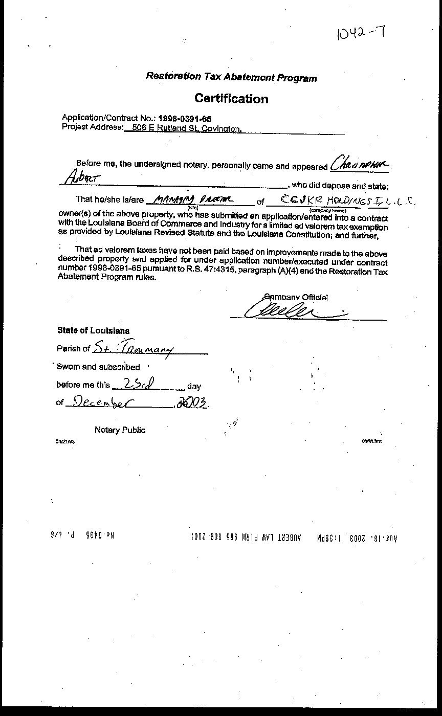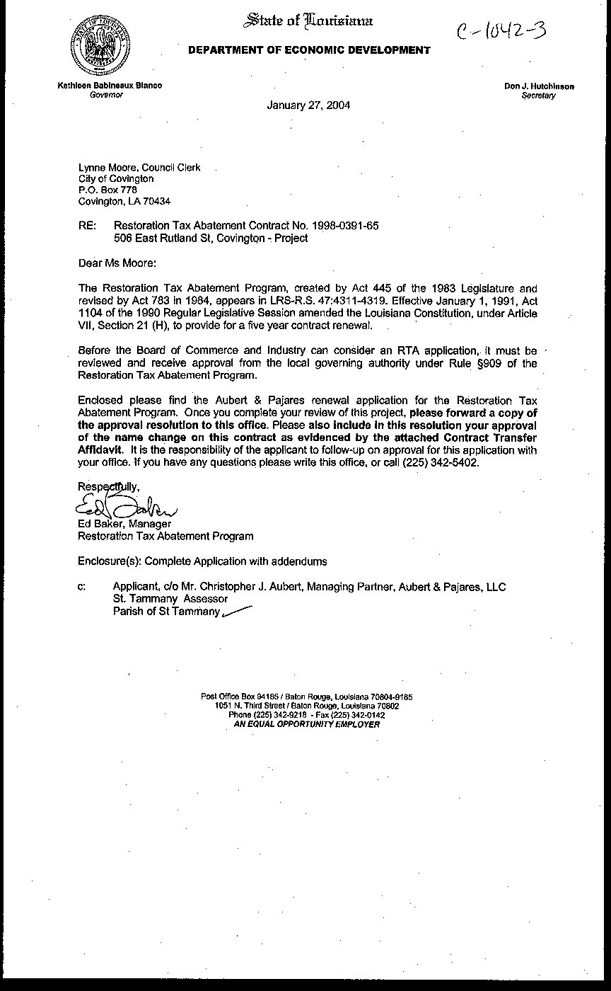 (RESTORATION TAX ABATEMENT CONTRACT NO. 1998-0391-65) TO