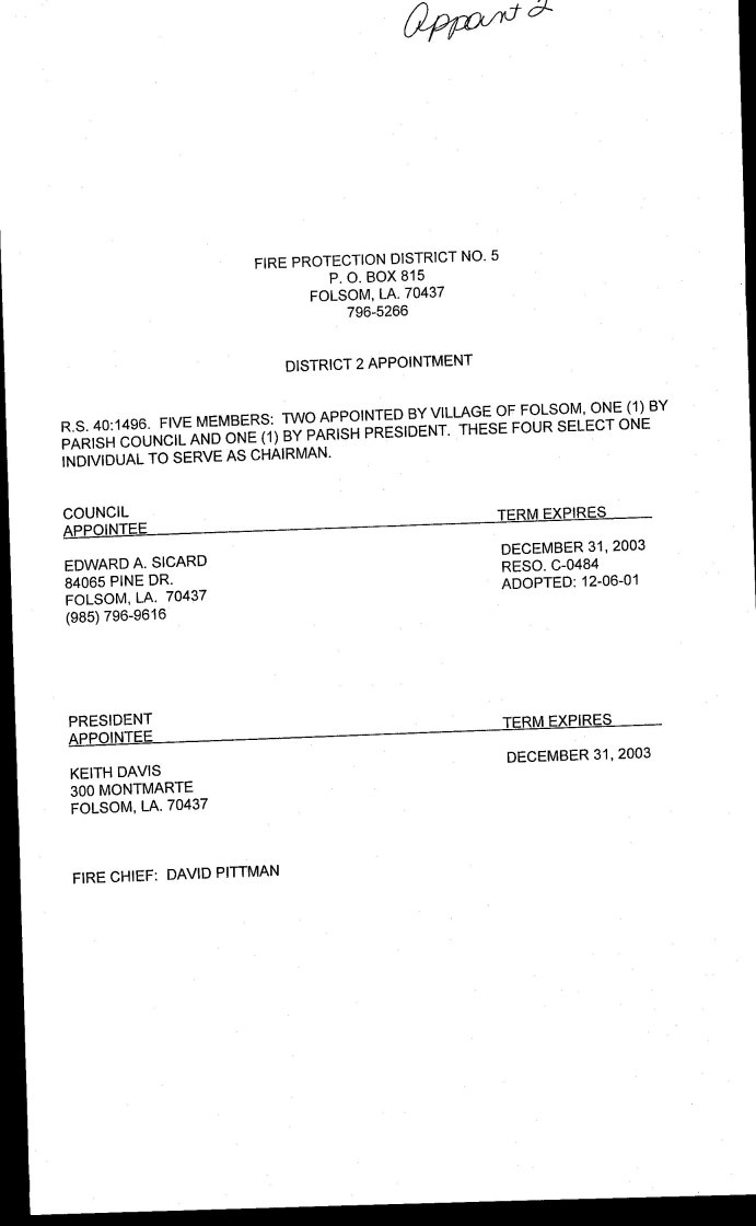 2) Resolution to reappoint Edward A. Sicard to Fire Protection District No. 5. (Thompson)
