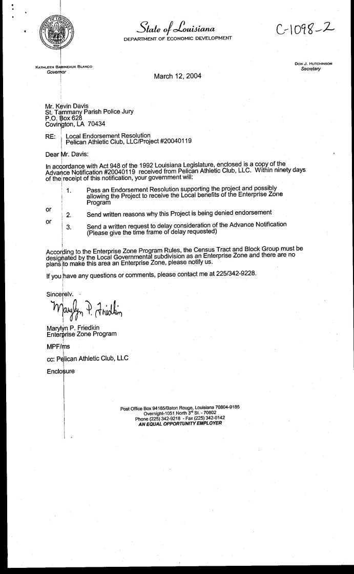 ENDORSEMENT OF PELICAN ATHLETIC CLUB, LLC, FOR PARTICIPATION IN